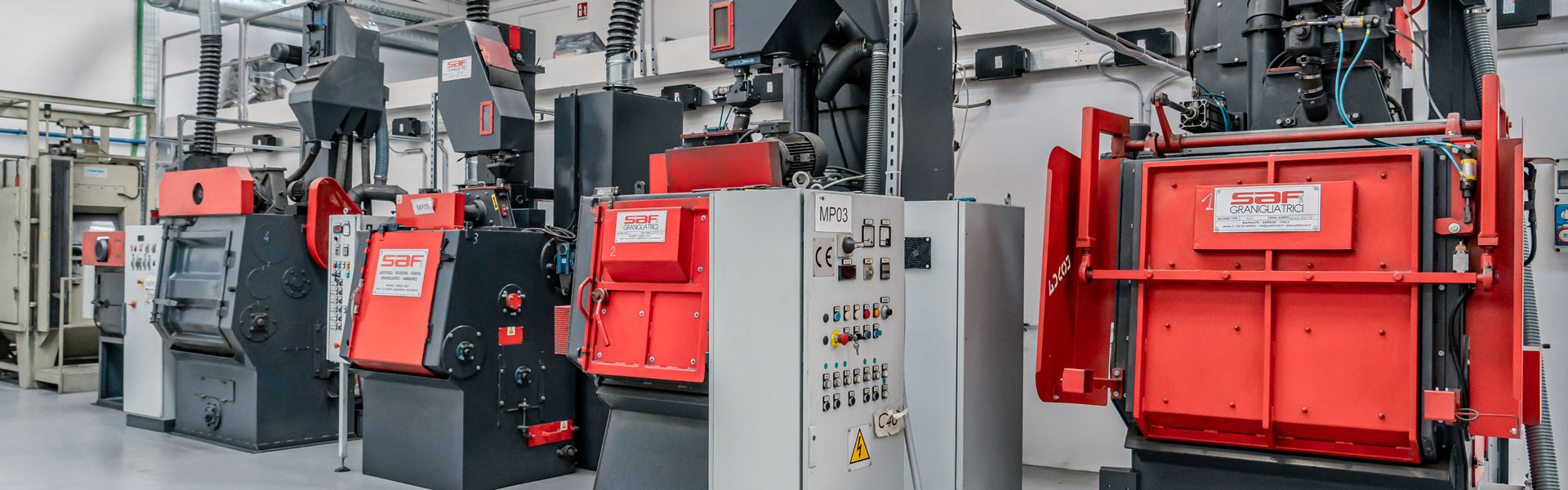 SBA dispone di cinque impianti di pallinatura a tappeto, con differenti capacità di carico, e di un impianto a grappolo, che consentono di definire cicli produttivi personalizzati in funzione delle quantità e delle caratteristiche del materiale da trattare.